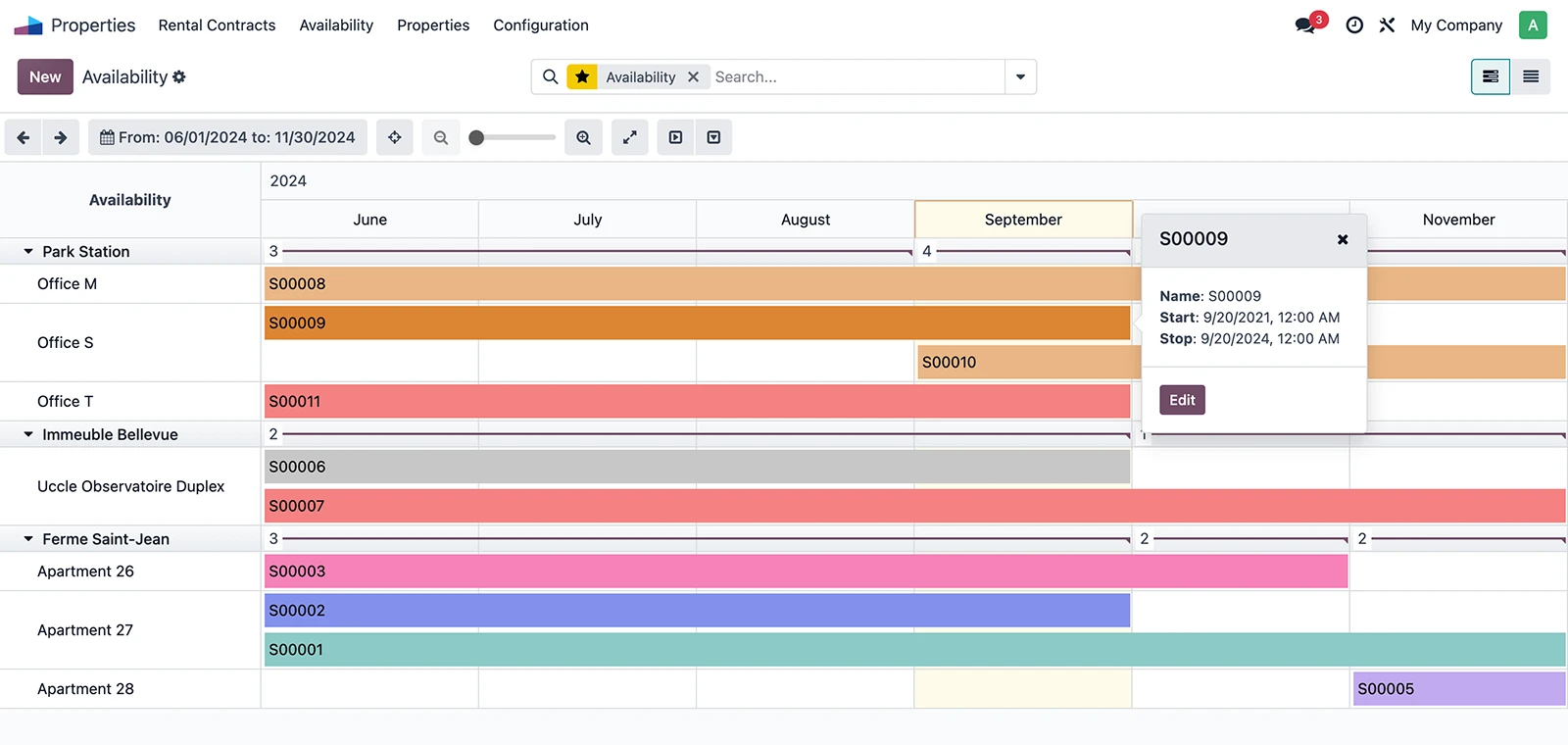 Visualize all rental contracts and property availability in a single, intuitive view.