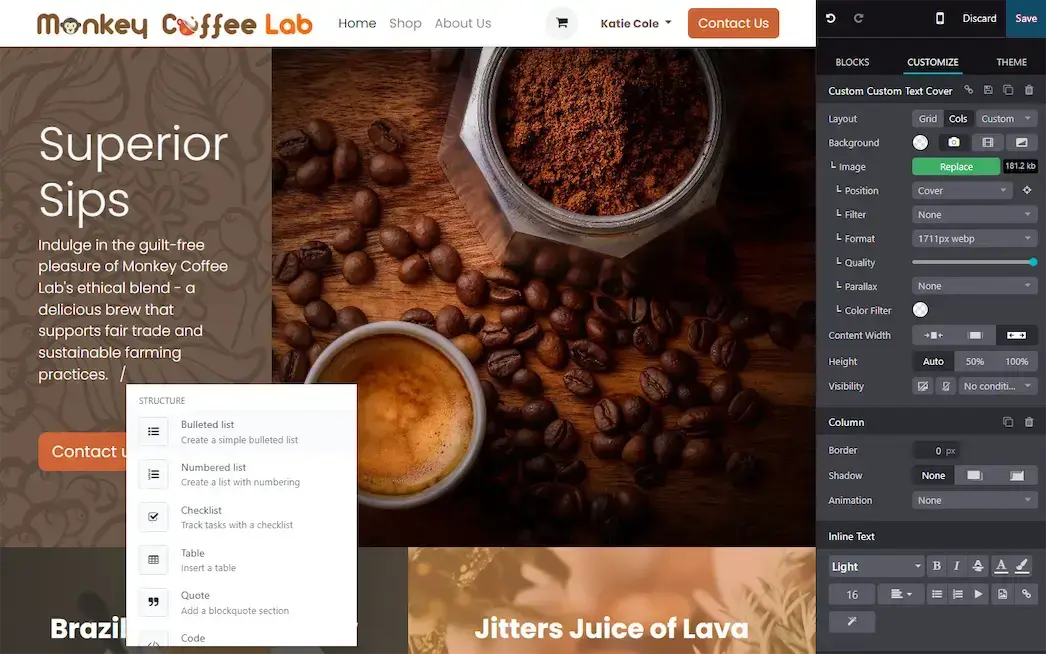 Simply drag and drop your building blocks. Need to fine-tune your layout? Apply filters and effects to your images? Want to animate an element? It's all possible right on the page.
